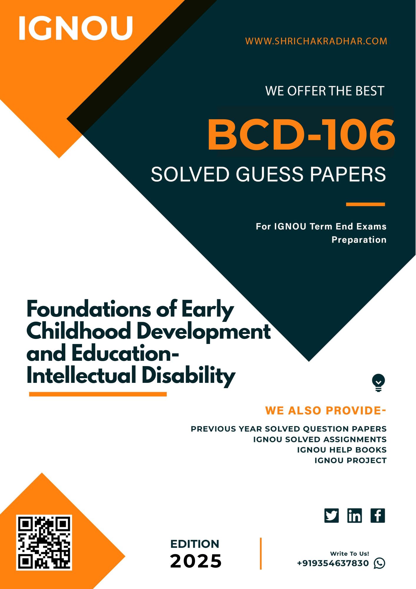 Are you looking for best quality IGNOU Solved Guess Papers Pdf Booklet & IGNOU Important Question Answers? We created IGNOU BCD 106 Solved Guess Papers with fully solved answers for your convenience. Here is the perfect IGNOU BCD 106 Important Question Answers in a descriptive way for those students who wish to pass out their upcoming IGNOU Term End Examination. These Solved Guess Papers solutions are time saving for the students because they will get each solutions of the expected questions shall be asked in the IGNOU BCD 106 question paper. Answers are well explained and language is easy for better understanding. Above all, buy this IGNOU BCD 106 Solved Guess Papers Solutions Foundations of Early Childhood Development and Education- Intellectual Disability?Guides/Reference Book and get best help for your coming examination.