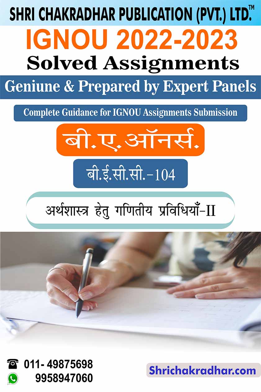 Are you looking for best quality IGNOU Solved Assignment Pdf Booklet? Therefore, we created IGNOU BECC 104 Solved Assignment with fully solved answers for your convenience. This is the perfect IGNOU BECC 104 Solved Assignment in a descriptive way for those students who wish to appear in upcoming TEE Examination and want to submit on their study centre. This IGNOU Solved Assignment BECC 104 is time saving for the students and they will get each and every solutions of the questions asked in the assignment. Answers are well explained and language is easy for better understanding. Above all, buy this BECC 104 Arthashastra mein Ganitiya Vidhiyaan II IGNOU Solved Assignment from IGNOU Study Material/Books and get best help for your coming examination.