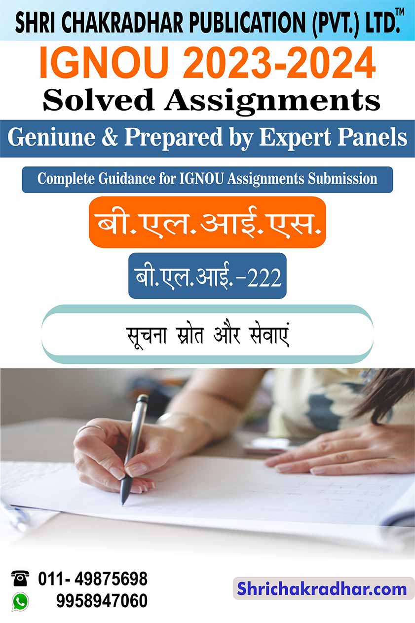 Are you looking for best quality IGNOU Solved Assignment Pdf Booklet? Therefore, we created IGNOU BLI 222 Solved Assignment with fully solved answers for your convenience. This is the perfect IGNOU BLI 222 Solved Assignment in a descriptive way for those students who wish to appear in upcoming TEE Examination and want to submit on their study centre. This IGNOU Solved Assignment BLI 222 is time saving for the students and they will get each and every solutions of the questions asked in the assignment. Answers are well explained and language is easy for better understanding. Above all, buy this BLI 222 Soochna Aur Sewayein?IGNOU Solved Assignment from IGNOU Study Material/Books and get best help for your coming examination.