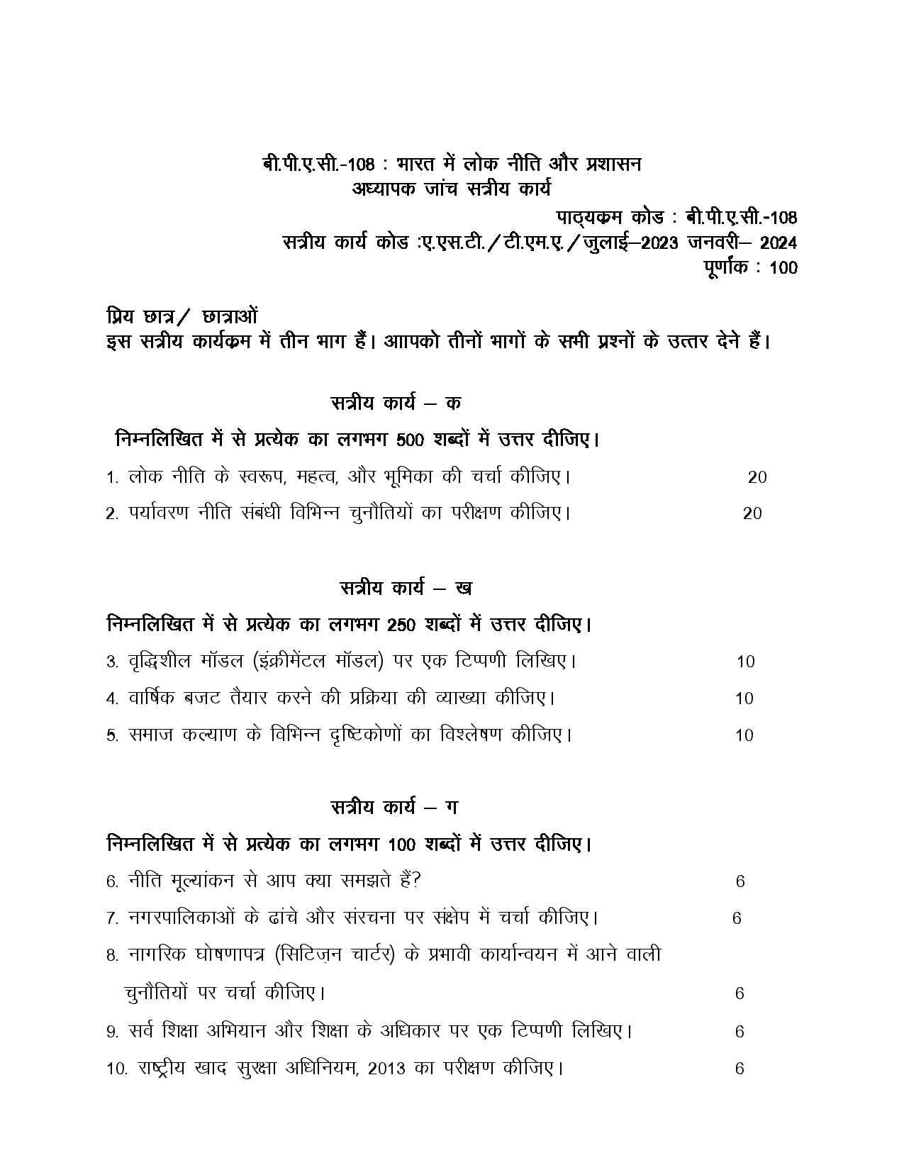 Are you looking for best quality IGNOU Solved Assignment Pdf Booklet? Therefore, we created IGNOU BPAC 108 Solved Assignment with fully solved answers for your convenience. This is the perfect IGNOU BPAC 108 Solved Assignment in a descriptive way for those students who wish to appear in upcoming TEE Examination and want to submit on their study centre. This IGNOU Solved Assignment BPAC 108 is time saving for the students and they will get each and every solutions of the questions asked in the assignment. Answers are well explained and language is easy for better understanding. Above all, buy this BPAC 108 Bharat me Lok Neeti aur Prashasan IGNOU Solved Assignment from IGNOU Study Material/Books and get best help for your coming examination.