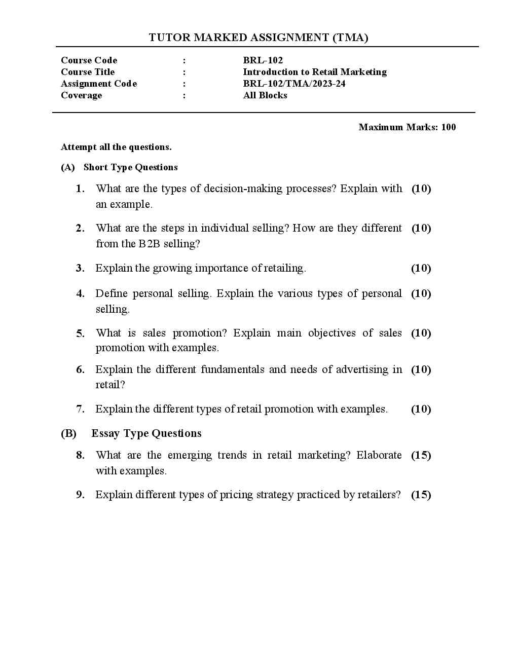 Are you looking for best quality IGNOU Solved Assignment Pdf Booklet? Therefore, we created IGNOU BRL 102 Solved Assignment with fully solved answers for your convenience. This is the perfect IGNOU BRL 102 Solved Assignment in a descriptive way for those students who wish to appear in upcoming TEE Examination and want to submit on their study centre. This IGNOU Solved Assignment BRL 102 is time saving for the students and they will get each and every solutions of the questions asked in the assignment. Answers are well explained and language is easy for better understanding. Above all, buy this BRL 102 Introduction to Retail Marketing Assignment from IGNOU Study Material/Books and get best help for your coming examination.