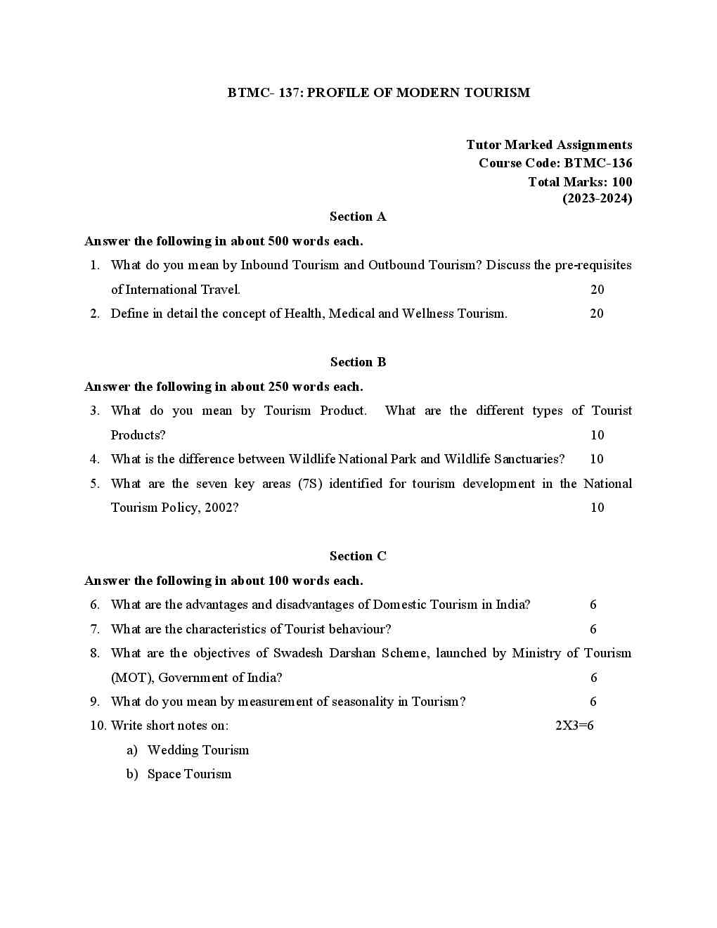 Are you looking for best quality IGNOU Solved Assignment Pdf Booklet? Therefore, we created IGNOU BTMC 137 Solved Assignment with fully solved answers for your convenience. This is the perfect IGNOU BTMC 137 Solved Assignment in a descriptive way for those students who wish to appear in upcoming TEE Examination and want to submit on their study centre. This IGNOU Solved Assignment BTMC 137 is time saving for the students and they will get each and every solutions of the questions asked in the assignment. Answers are well explained and language is easy for better understanding. Above all, buy this BTMC 137 Profile of Modern Tourism Solved Assignment from IGNOU Study Material/Books and get best help for your coming examination.