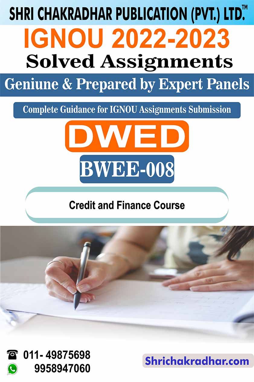 Are you looking for best quality IGNOU Solved Assignment Pdf Booklet? Therefore, we created IGNOU BWEE 8 Solved Assignment with fully solved answers for your convenience. This is the perfect IGNOU BWEE 8 Solved Assignment in a descriptive way for those students who wish to appear in upcoming TEE Examination and want to submit on their study centre. This IGNOU Solved Assignment BWEE 8 is time saving for the students and they will get each and every solutions of the questions asked in the assignment. Answers are well explained and language is easy for better understanding. Above all, buy this BWEE 8 Credit and Finance IGNOU Solved Assignment from IGNOU Study Material/Books and get best help for your coming examination.