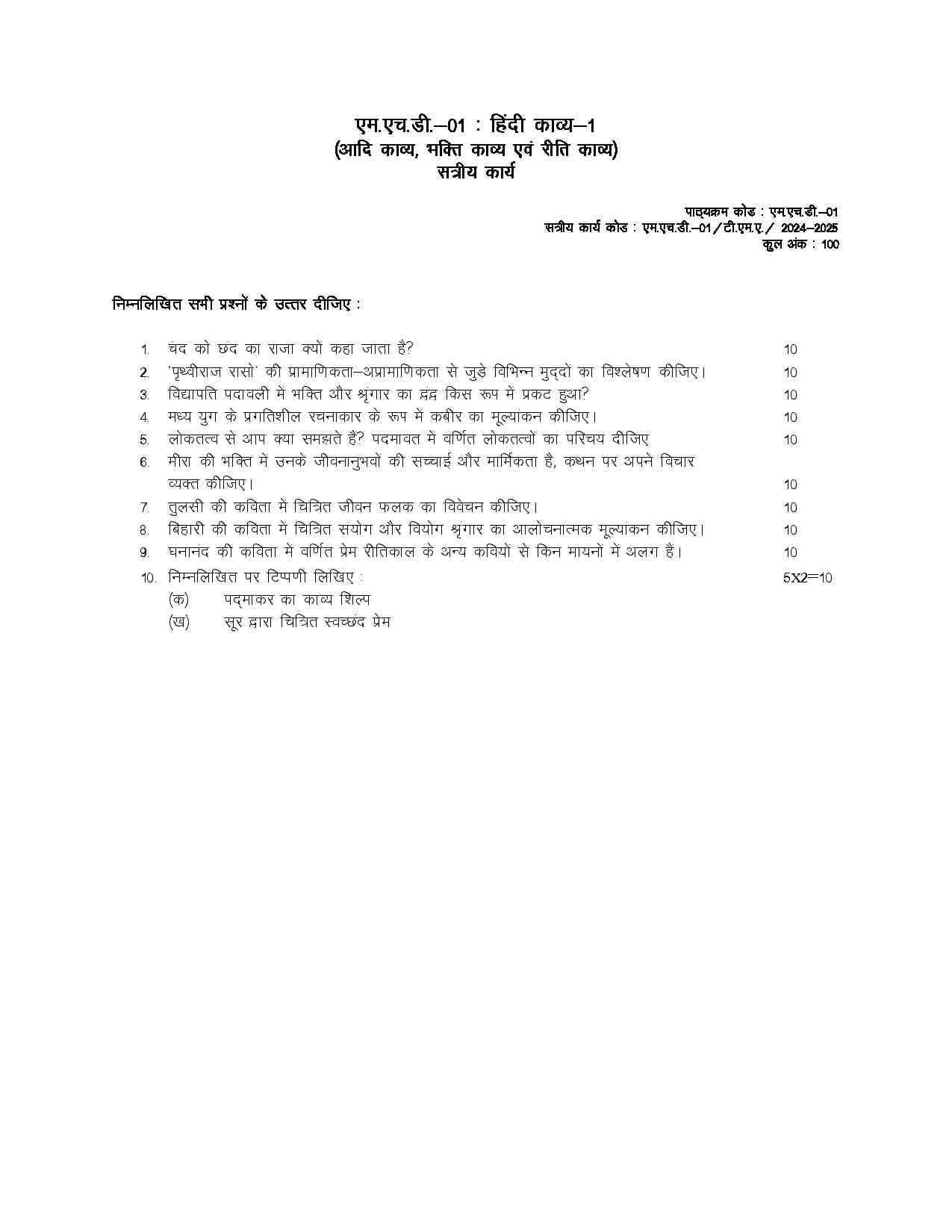 Are you looking for best quality IGNOU Solved Assignment Pdf Booklet? Therefore, we created IGNOU MHD 1 Solved Assignment with fully solved answers for your convenience. This is the perfect IGNOU MHD 1 Solved Assignment in a descriptive way for those students who wish to appear in upcoming TEE Examination and want to submit on their study centre. This IGNOU Solved Assignment MHD 1 is time saving for the students and they will get each and every solutions of the questions asked in the assignment. Answers are well explained and language is easy for better understanding. Above all, buy this MHD 1 Hindi Kavya-1 (Aadikavya, Bhaktikavya Evam Reetikavya) from IGNOU Study Material/Books and get best help for your coming examination.