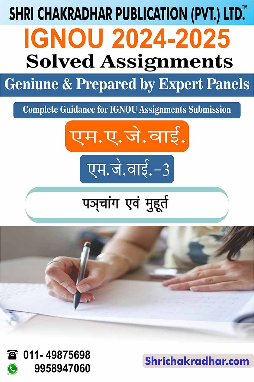 Are you looking for best quality IGNOU Solved Assignment Pdf Booklet? Therefore, we created IGNOU MJY 3 Solved Assignment with fully solved answers for your convenience. This is the perfect IGNOU MJY 3 Solved Assignment in a descriptive way for those students who wish to appear in upcoming TEE Examination and want to submit on their study centre. This IGNOU Solved Assignment MJY 3 is time saving for the students and they will get each and every solutions of the questions asked in the assignment. Answers are well explained and language is easy for better understanding. Above all, buy this MJY 3 Panchang Evam Muhurat IGNOU Solved Assignment from IGNOU Study Material/Books and get best help for your coming examination.