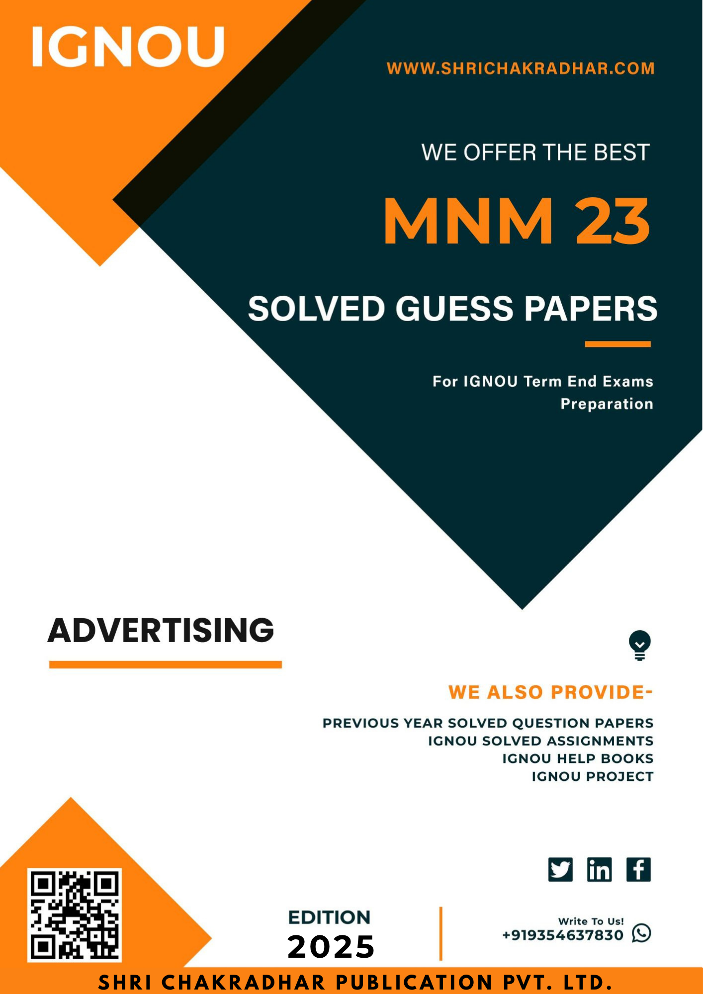 Are you looking for best quality IGNOU Solved Guess Papers Pdf Booklet & IGNOU Important Question Answers? We created IGNOU MNM 23 Solved Guess Papers with fully solved answers for your convenience. Here is the perfect IGNOU MNM 23 Important Question Answers in a descriptive way for those students who wish to pass out their upcoming IGNOU Term End Examination. These Solved Guess Papers solutions are time saving for the students because they will get each solutions of the expected questions shall be asked in the IGNOU MNM 23 question paper. Answers are well explained and language is easy for better understanding. Above all, buy this IGNOU MNM 23 Solved Guess Papers Solutions Advertising Guides/Reference Book and get best help for your coming examination.