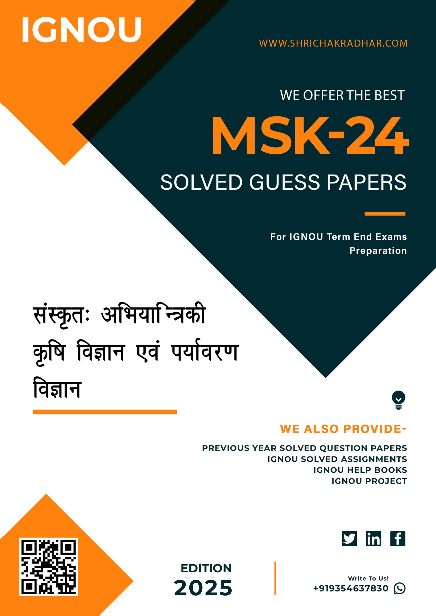 Are you looking for best quality IGNOU Solved Guess Papers Pdf Booklet & IGNOU Important Question Answers? We created IGNOU MSK 24 Solved Guess Papers with fully solved answers for your convenience. Here is the perfect IGNOU MSK 24 Important Question Answers in a descriptive way for those students who wish to pass out their upcoming IGNOU Term End Examination. These Solved Guess Papers solutions are time saving for the students because they will get each solutions of the expected questions shall be asked in the IGNOU MSK 24 question paper. Answers are well explained and language is easy for better understanding. Above all, buy this IGNOU MSK 24 Solved Guess Papers Solutions Sanskrit: Abhiyantriki Krishi Vigyan Evam Paryawaran Vigyan our Guides/Reference Book and get best help for your coming examination.